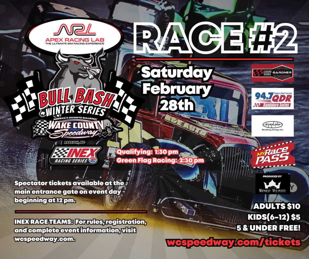 LIVE BROADCAST COVERAGE SATURDAY 1:30PM EST – Round #2 Apex Racing Lab BULL BASH Winter Series at Wake County Speedway – Raleigh, NC